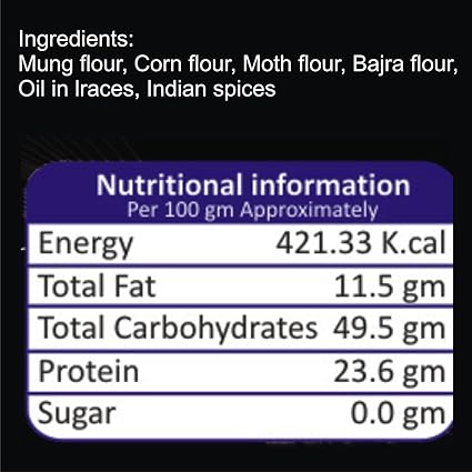 Ingredients: Mung flour, Corn flour, Moth flour, bajara flour, Oil in traces, Indian spices